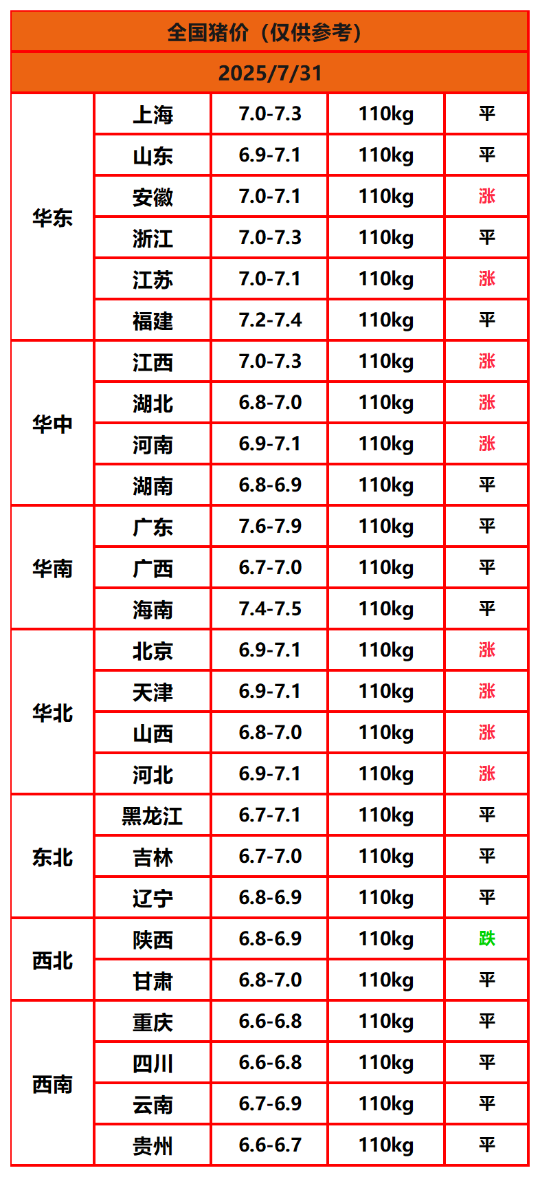 2025年7月31日猪价,今日全国猪价行情走势:9涨1平16跌。