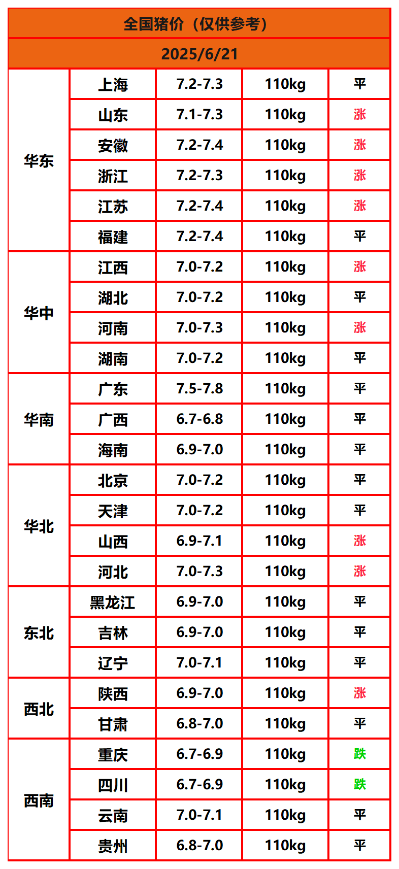 2025年6月21日猪价,今日全国猪价行情走势:9涨15平2跌。
