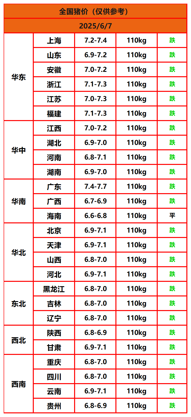 2025年6月7日猪价,今日全国猪价行情走势:0涨1平25跌。