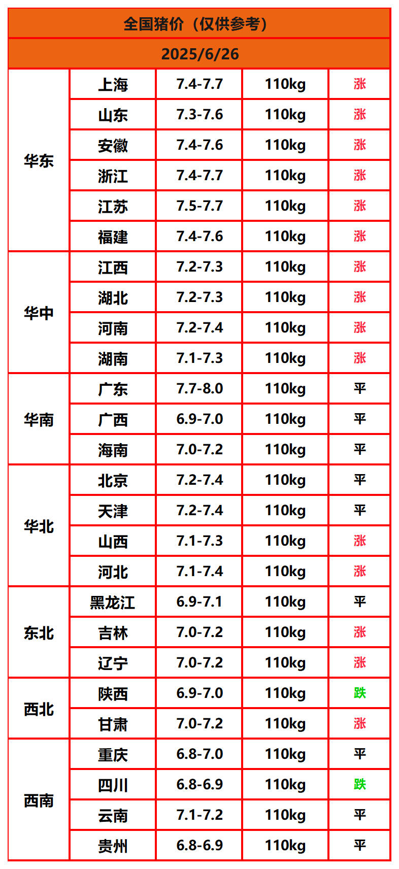 2025年6月26日猪价,今日全国猪价行情走势:15涨9平2跌。