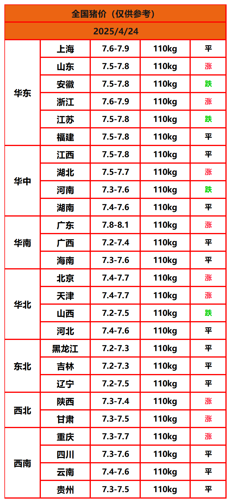 2025年4月24日猪价,今日全国猪价行情走势:9涨13平4跌。