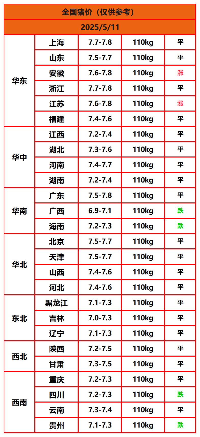 2025年5月11日猪价,今日全国猪价行情走势:2涨20平4跌。