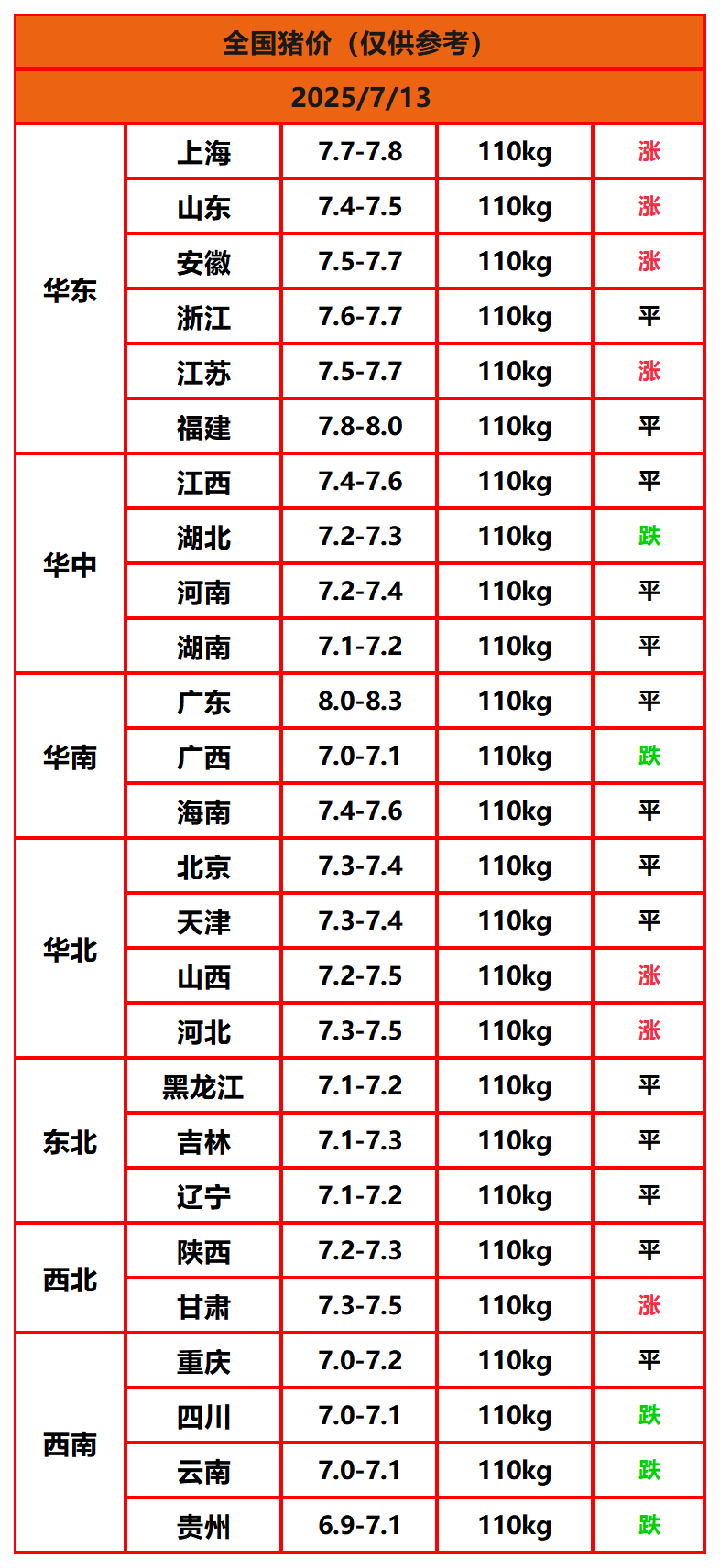 2025年7月13日猪价,今日全国猪价行情走势:7涨14平5跌。